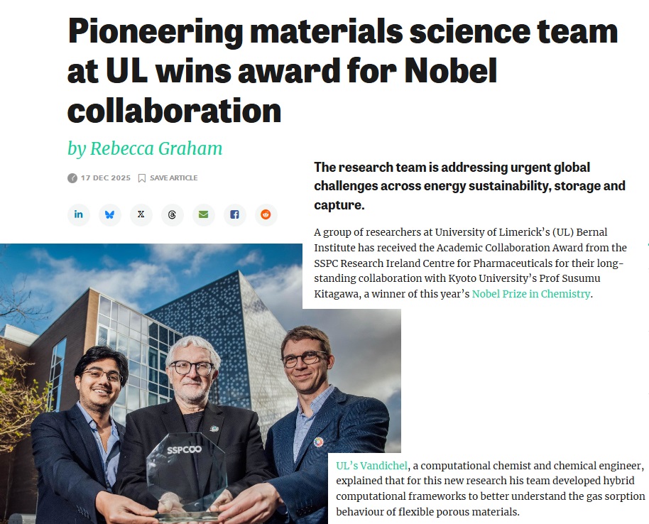 We’re delighted to share that Silicon Republic has featured our recent SSPC Academic Collaboration Award, highlighting the UL–Kyoto partnership led by Prof. Michael Zaworotko, Prof. Soumya Mukherjee, and our group leader Prof. Matthias Vandichel. The article showcases the team’s pioneering work on MOFs and flexible sorbents, developed through long‑standing collaboration with 2025 Nobel Laureate Prof. Susumu Kitagawa. This coverage also reflects the wider contributions from across the collaboration, including computational insights from our group—work strengthened by team member Dr. Sousa JavanNikkhah.