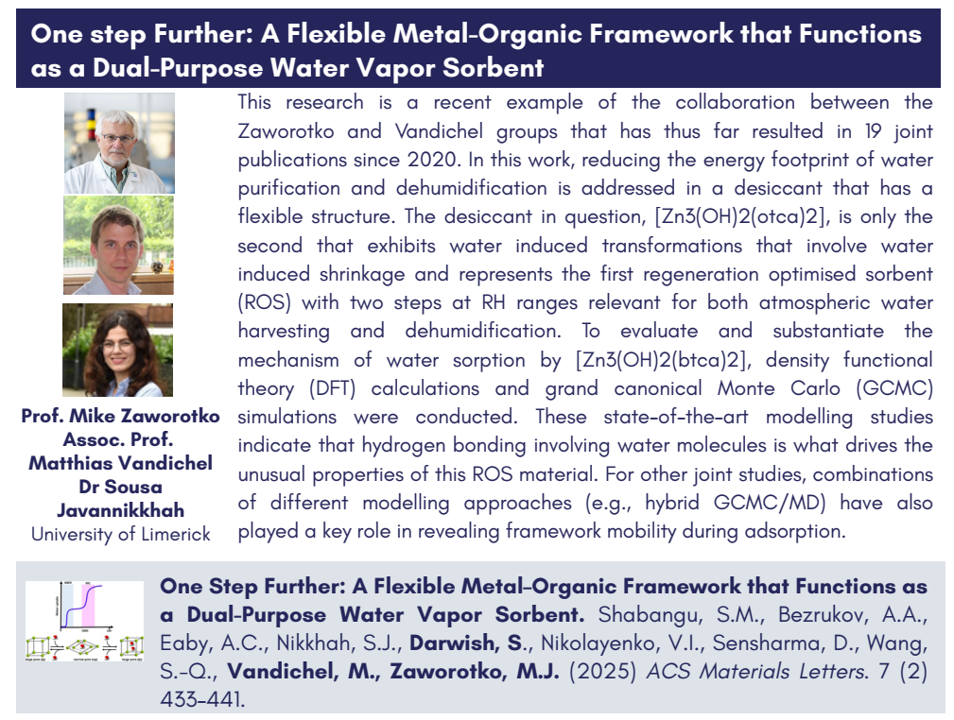 Our collaborative work on MOFs with Zaworotko Group, combining experiment and theory , has been featured in the SSPC Modelling Spotlight. In particular, our recent paper highlights a flexible MOF as a dual-purpose water vapor sorbent, where we applied advanced modelling approaches such as DFT and hybrid GCMC/MD simulations using our in-house code.